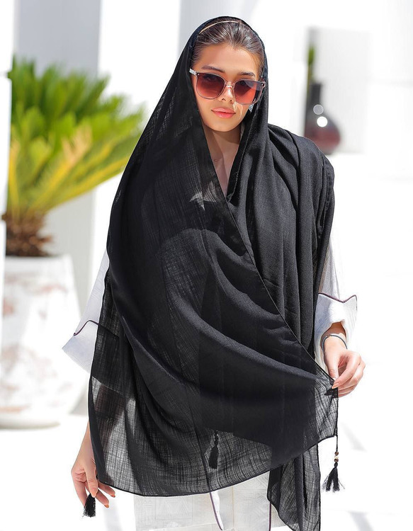 ☘️شال نخی لنین مشکی ساده منگوله دار